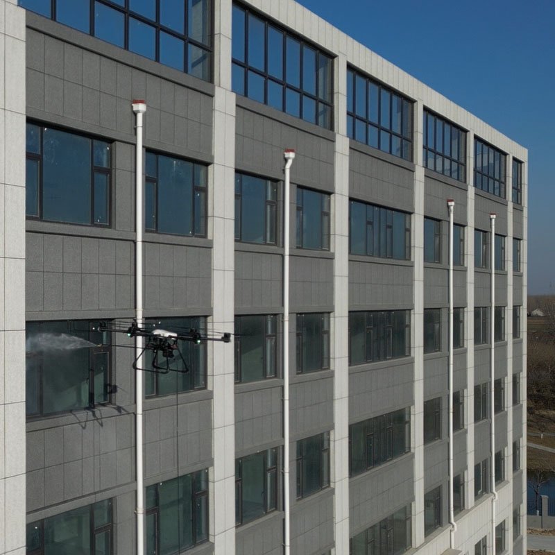 The tethered wash drone supplied continuous water while the cleaning drone handled high-pressure spraying. This modern solution improved building appearance and reduced costs, replacing outdated manual cleaning.
